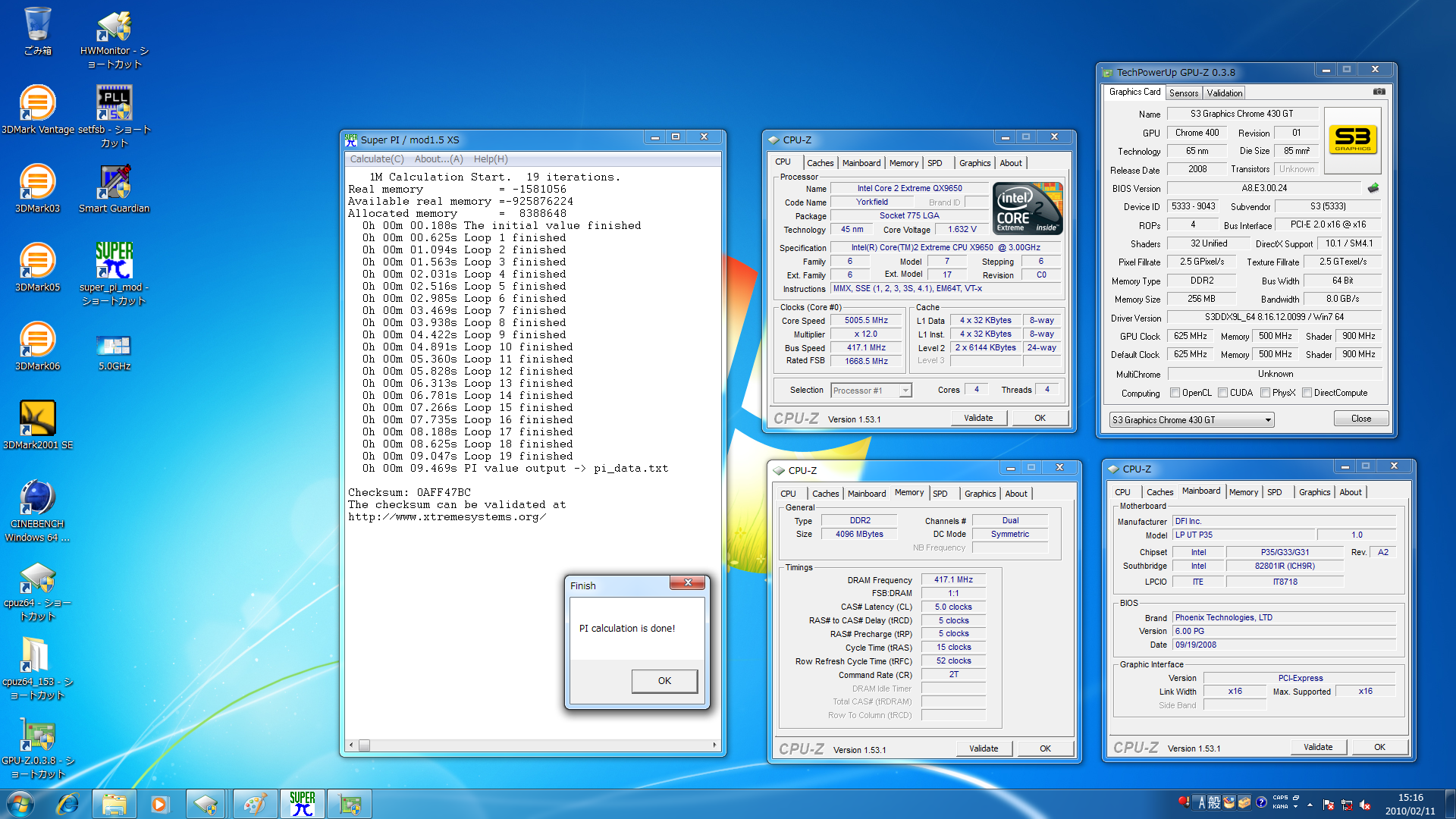 正直、ここまでうまく行くとは思っていませんでした。むしろ、エタノールが漏洩して大惨事に…って気がしていたので、あっさり目標を達成した上5.15GHzでSuper PI 1Mを完走させられるなどとは驚きです。心残りなのは、マザーボードのPCI Express x16スロットが『Chrome 430 GT』以外を受付ないという奇病を発症していたことですね。これさえなければ3DMarkにもチャレンジできたのですが…。