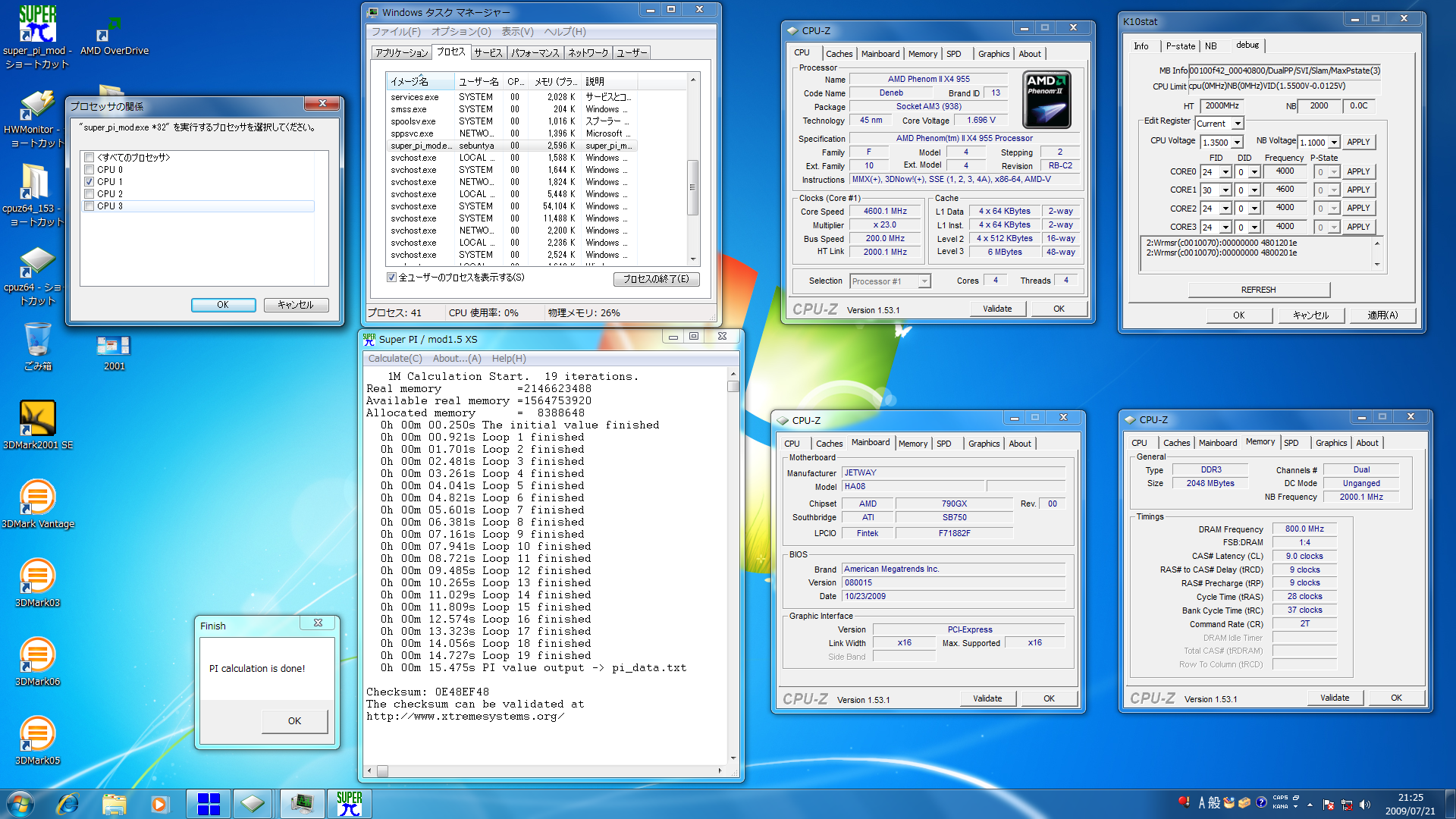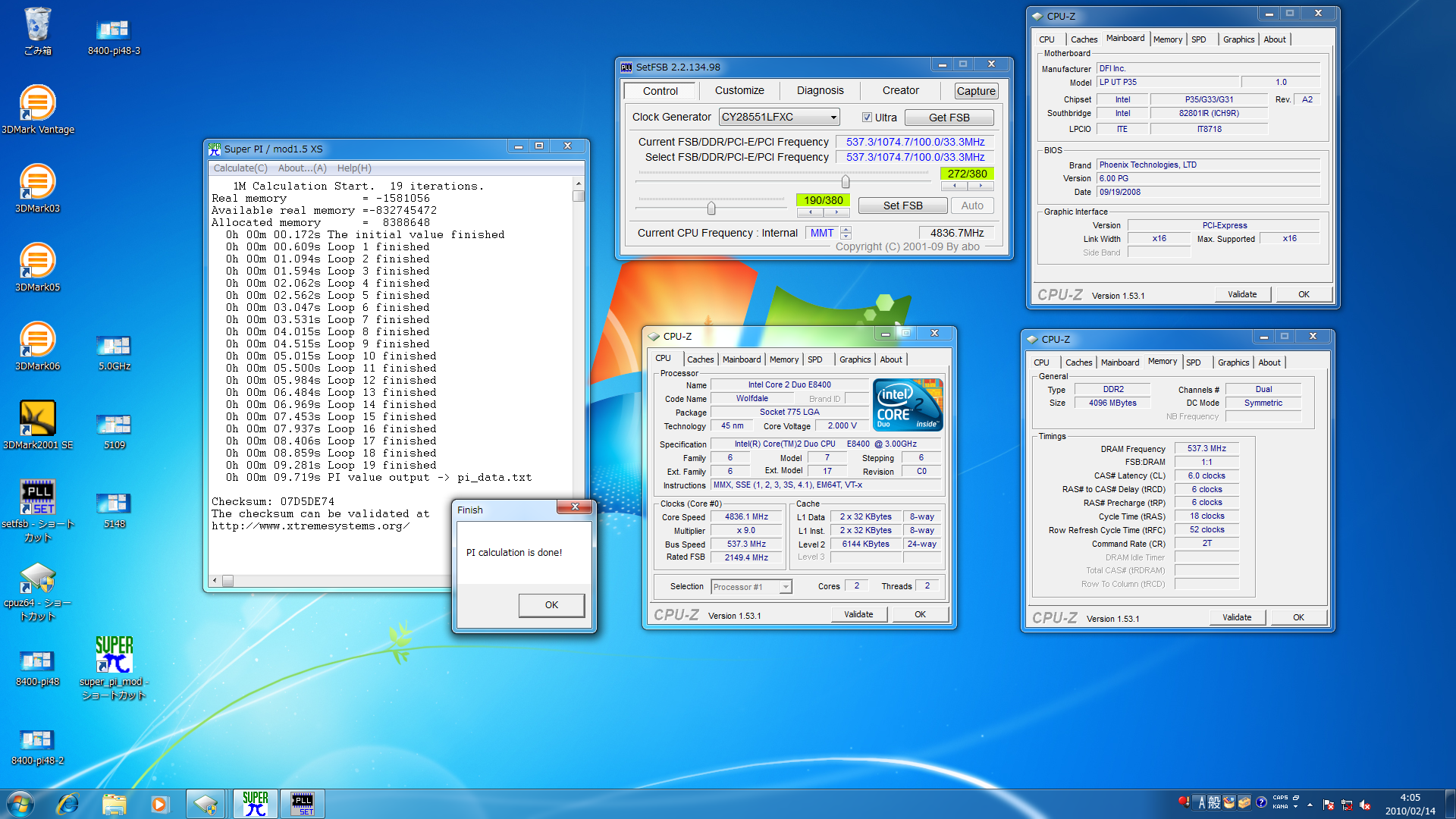 Super PIのタイムとしては、約5.15GHzというクロックで完走させることのできた『Core 2 Extreme QX9650』が最速の9.204秒を記録しています。動作クロックだけなら5.7GHzで完走した『Pentium 4 631』がトップですが、こちらはタイムが遅いですね〜。5.4GHzで完走した際には25.110秒だったのですが、クロックが上がってスコアが下がってしまいました(汗