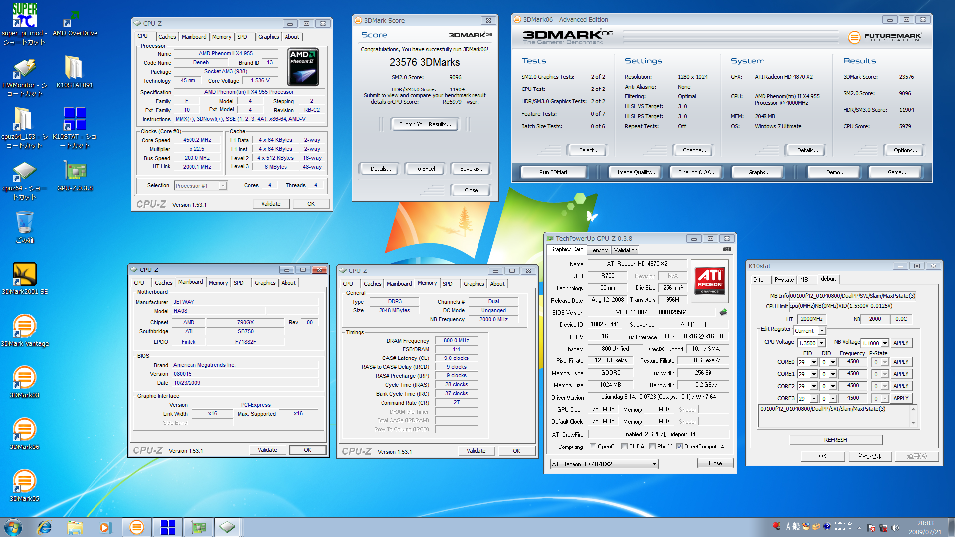 なお、Intel環境の方では何故か調子が悪く動かなかった『Radeon HD 4870 X2』ですが、AMD環境の方では動作してくれたので、全コア4.5GHzにOCした『Phenom II X4 955 Black Edition』で3DMark06を完走させることも出来ました。