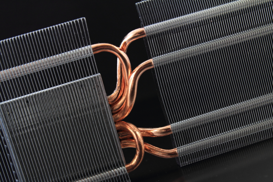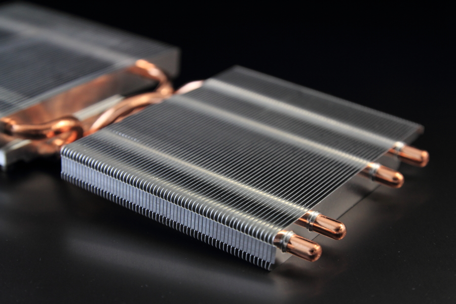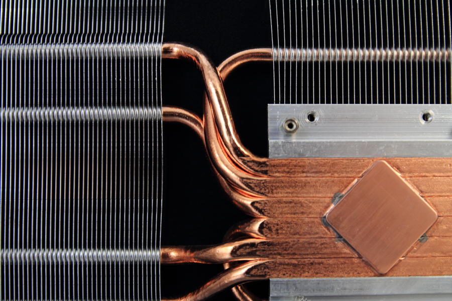 ところが、『HD7970-DC2-3GD5』が搭載しているヒートシンクを確認してみると、ベースユニット自体は確かにヒートパイプダイレクトタッチ仕様となっているのですが、そのヒートパイプに銅板がろう付けで接着されています。つまり、『HD7970-DC2-3GD5』が搭載しているDirectCU IIクーラーは、ヒートパイプとGPUの間に銅板を挟んだ非ダイレクトタッチ仕様となっているということです。