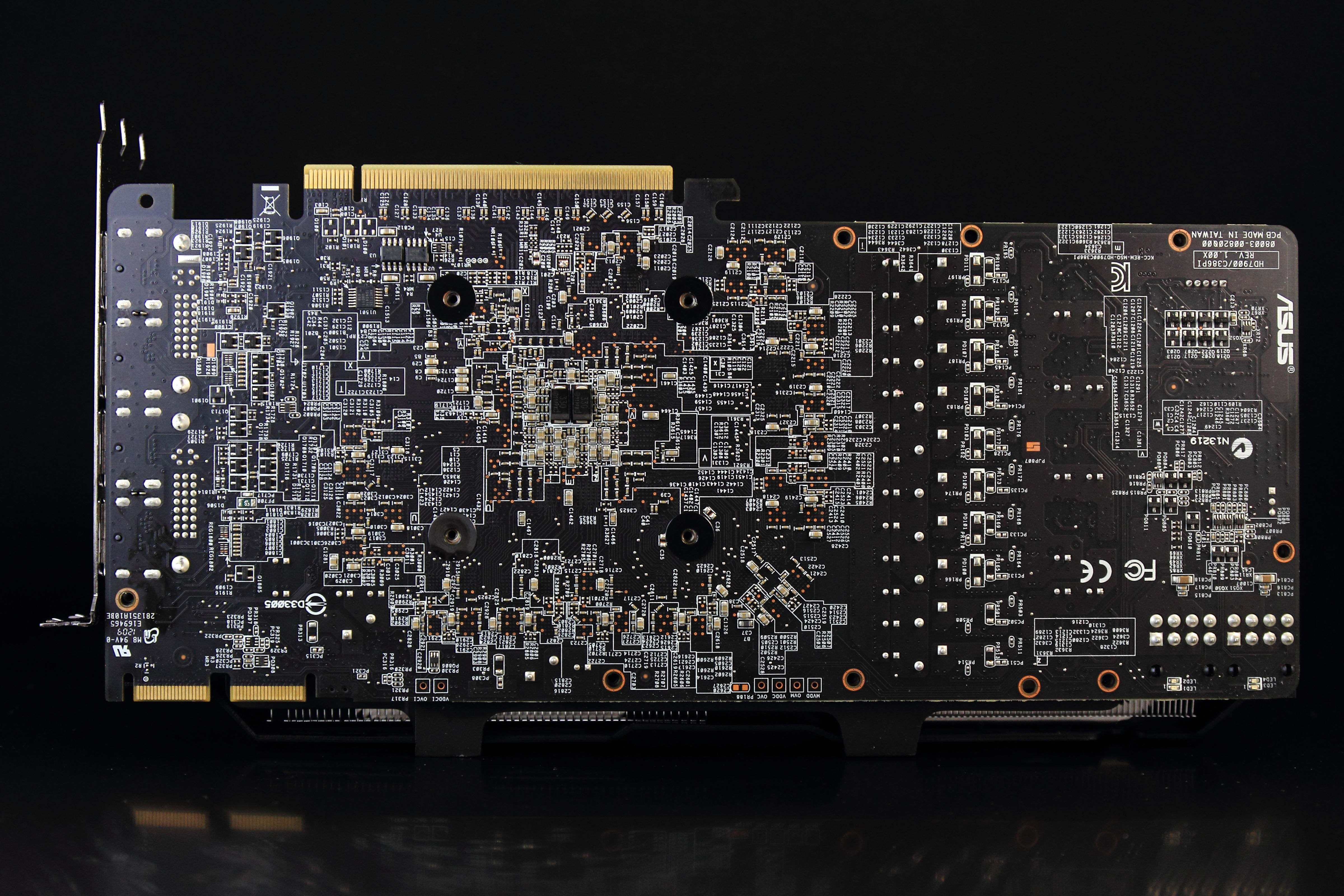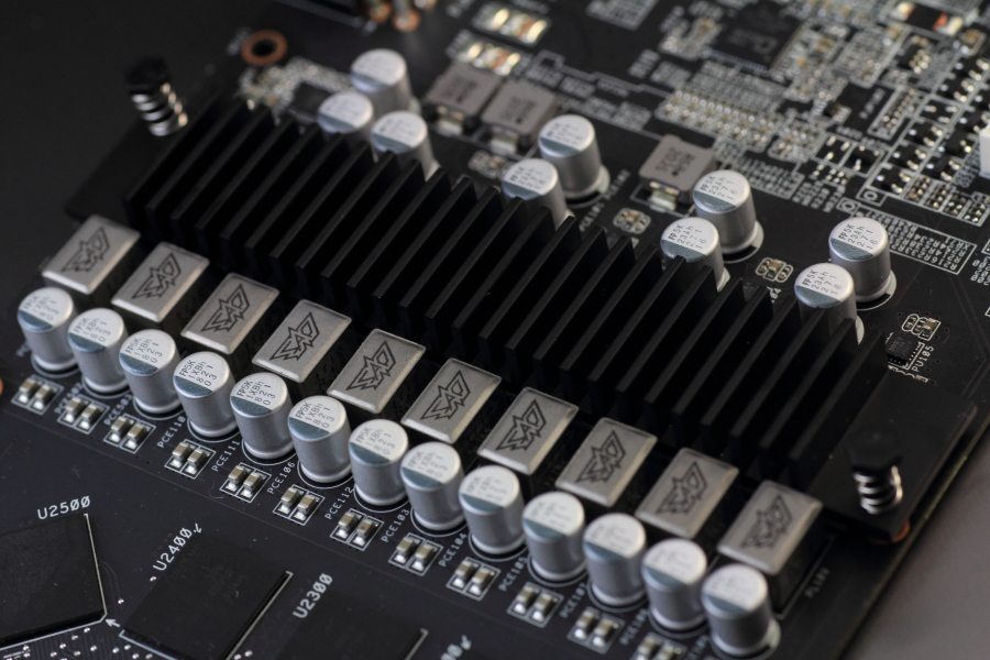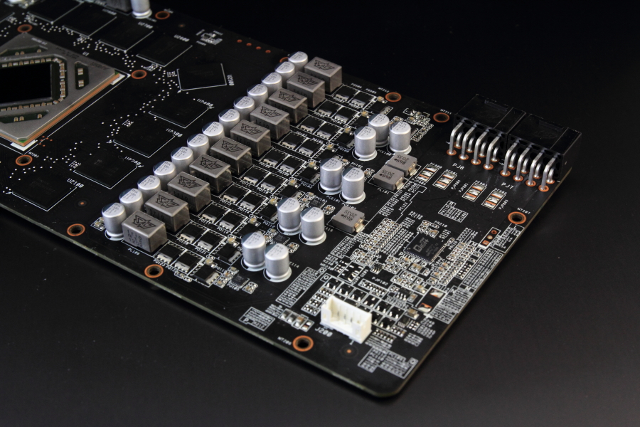 重厚感のある3スロット占有GPUクーラーをキャストオフすると、ASUSオリジナル設計の基板が姿を現します。リファレンスデザインとはかなり異なる基板レイアウトなのですが、特に目を引くのはASUSが「Super Alloy Power」と呼ぶVRM部分ですね。