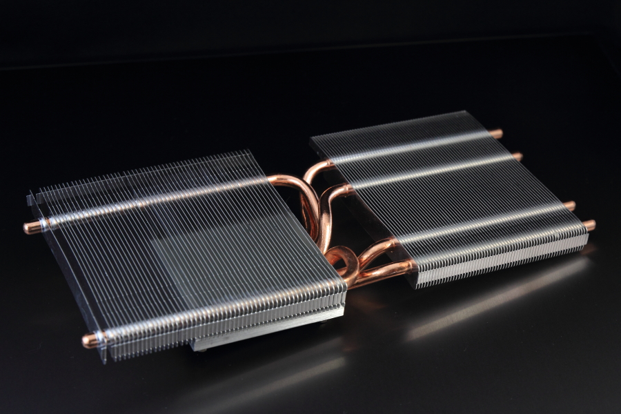 「DirectCU IIシリーズ」のGPUクーラーには、2スロット占有のものや3スロット占有のものなど、ビデオカードのスペックに応じていくつか種類がありますが、共通している特徴として、ヒートパイプがGPUに直接接地するヒートパイプダイレクトタッチ仕様のベースユニットを採用していること、2基の冷却ファンを搭載していることが上げられます。