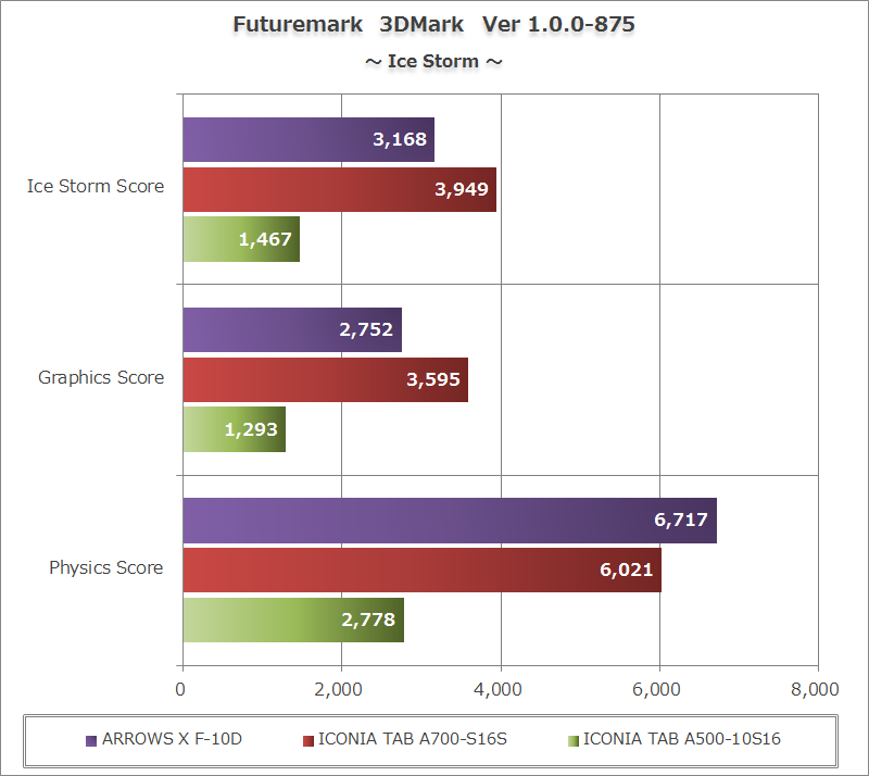 新しいベンチマークテストでかつ、個人的に馴染みのないAndroidのベンチマークテストなのでスコア的に良いのか悪いのかよく分からないところですが、とりあえず総合スコアトップは『ICONIA TAB A700-S16S』ですね。ただし、Physics Scoreでは『ARROWS X F-10D』がトップに立っています。この辺りは最大動作クロックの差なのでしょうか?