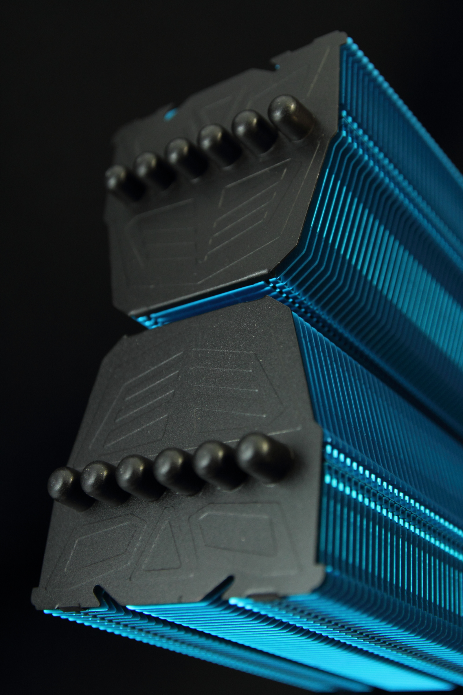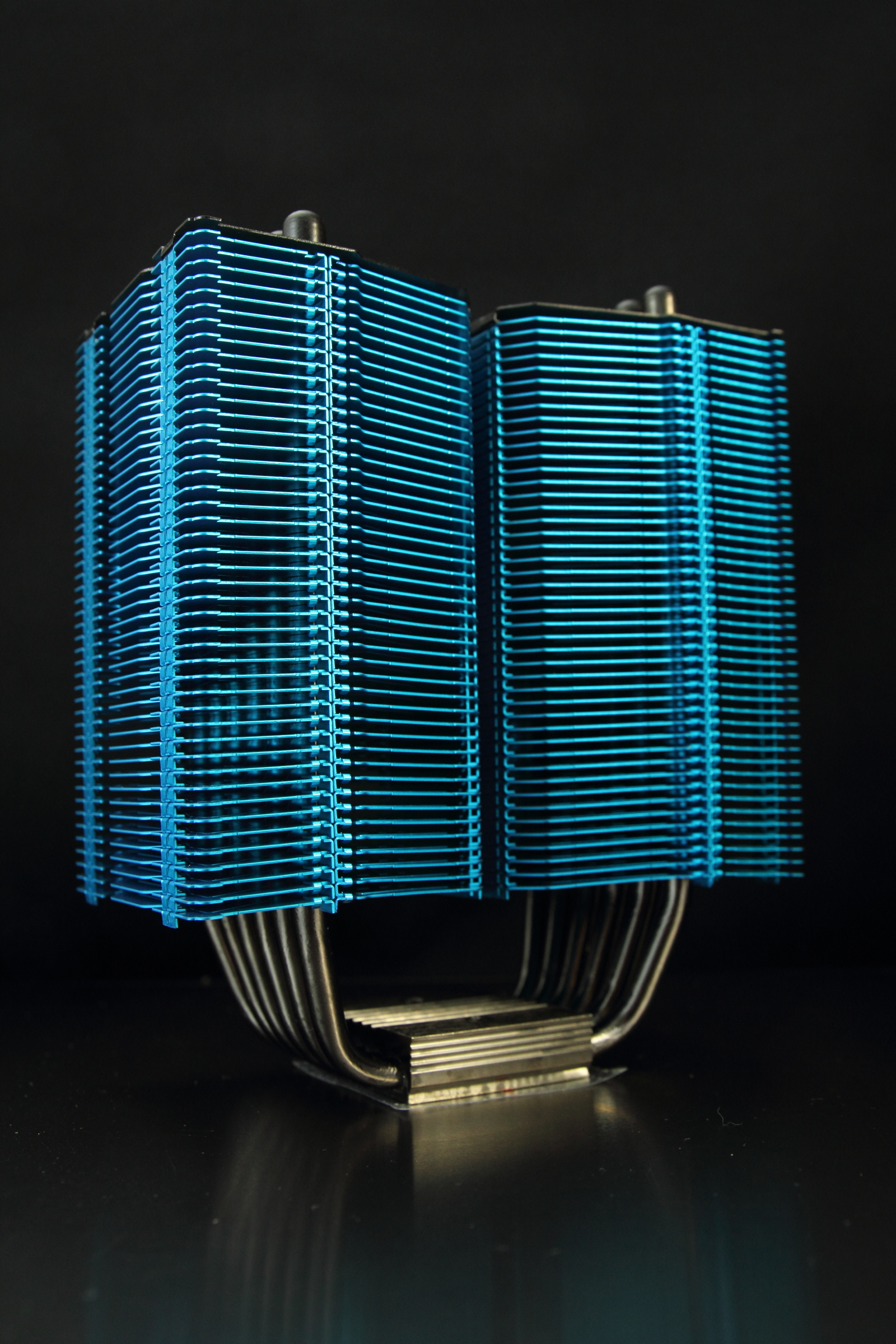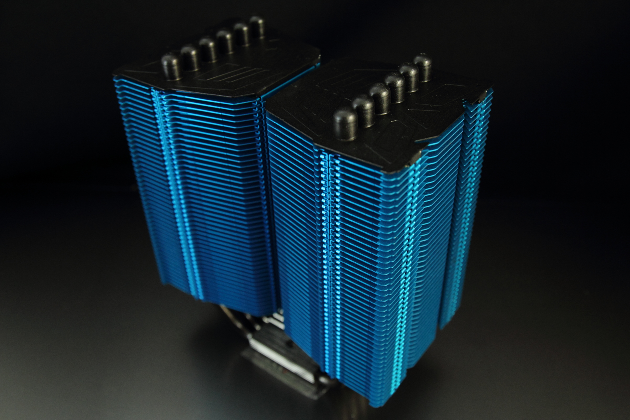 せっかくのカラーバリエーションなのですから、最上段までフィンと同じカラーリングにしてしまえばいいと思うところなのですが、Rev.B以降のMegahalemsシリーズでは、放熱ユニットの最上段の飾り板にステンレス製のプレートを採用しています。そのため、アルミ製フィンと同じカラーアルマイト処理は出来ません。ステンレスプレートが黒色なのは、同系統の色付けをするより、黒に塗っておいた方が見栄えが良かったからなのかもしれません。