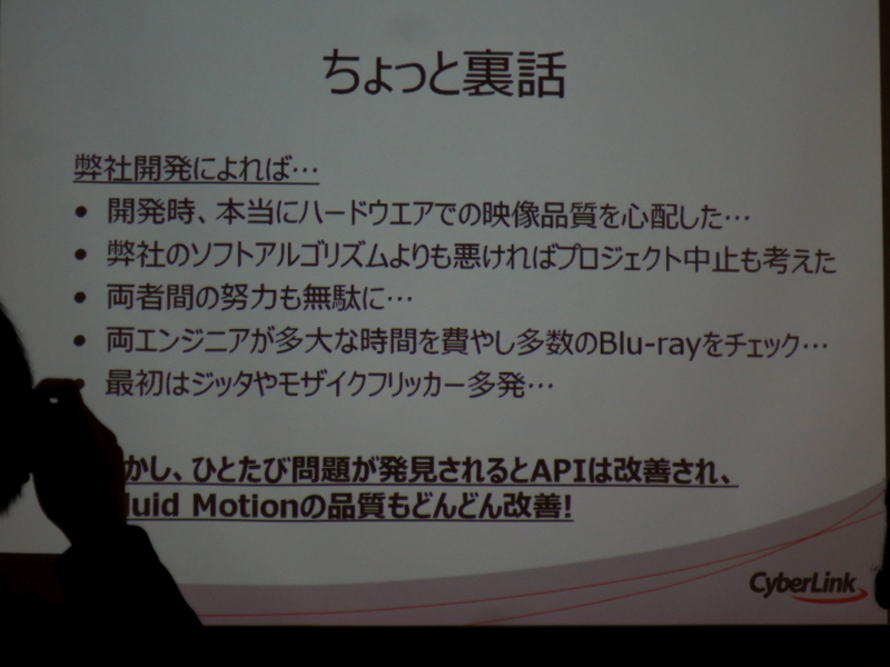 さて、Kaveri登場当初のイベントでは、アプリケーションを選ばず利用できると宣伝されていたこの機能でしたが、勉強会開催時点でFluid Motion Videoを利用できる再生ソフトはCyberLinkのPower DVDのみ。このあたりについて、CyberLinkの担当者さんの「裏話」で語られた内容からすると、どうやらそう簡単に実現できる代物ではなかったということのようです。