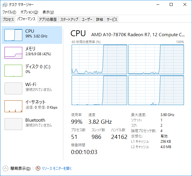 実際に負荷を掛けたときの負荷を見てみると、CPU負荷は100%、メモリもそれなりに使用していることから、CPUとメモリの安定性を確認できそうです。