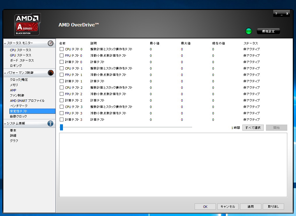 ストレステストは「安定性テスト」として実装されており、実行するテストが選択できる他、テストの実行時間を1分から7日の間で選ぶことができます。