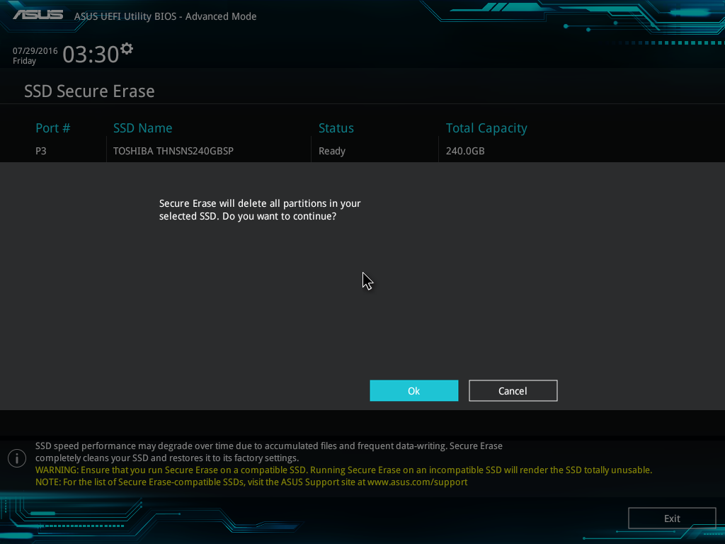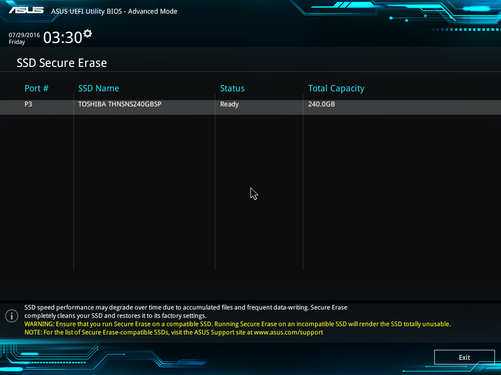 そこで活躍してくれるのが、ASUS Z170-AのUEFI上に設けられた「Secure Erase」機能。サクッとSSDのSecure Eraseが実行できます。